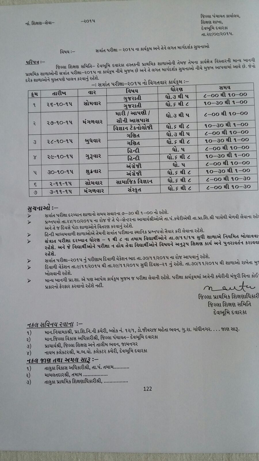 જીલ્લા શિક્ષણ સમિતિ, દેવભૂમિ દ્વારકા ની પ્રાથમિક શાળાઓ માટે સત્રાંત પરીક્ષા ૨૦૧૫નોં કાર્યક્રમ